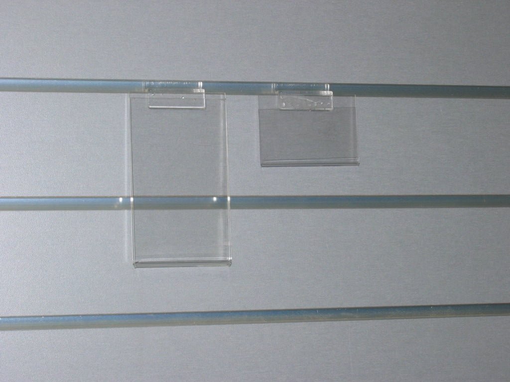 The Plankwall's clear slatwall clip with permanent adhesive allows a wide range of flat accessories, such as wall-mounted sign holders, to be used on slatwall panels, keeping displays straight, secure, and professional.