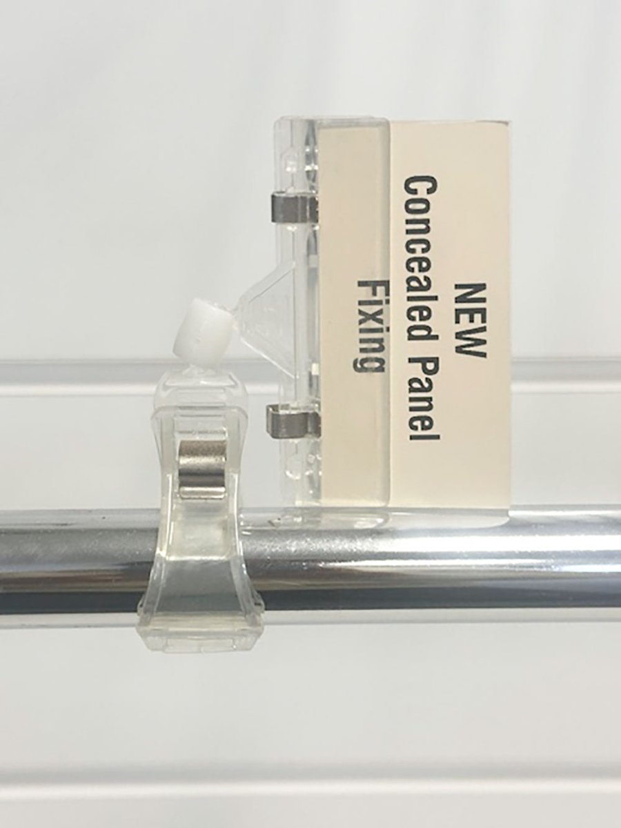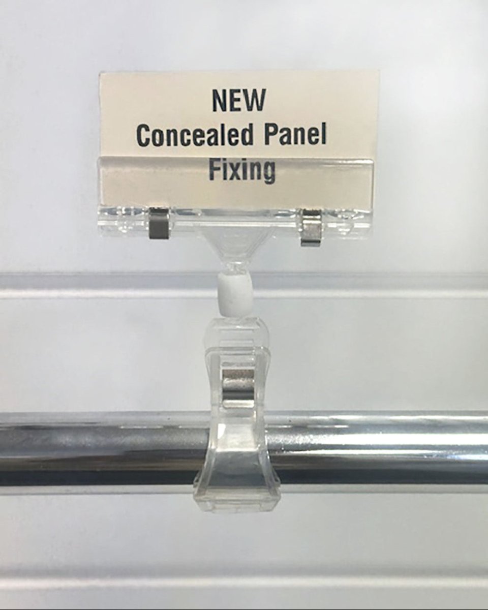 Plankwall® Card Clip is a secure, rotating-head signage clamp for 30mm tubing, designed to hold price cards and small signs neatly in place, and can also clip onto rails and 18mm panel edging.