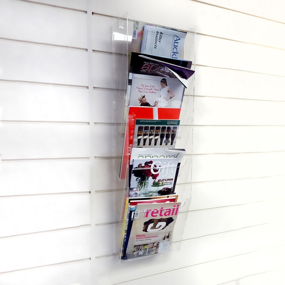 Wall-mounted five-tier magazine display rack designed to showcase brochures, information, and catalogues, fixed directly to the wall or mounted onto slatwall, keeping printed material clean, visible, and effortlessly accessible across retail stores, offices, showrooms, reception areas, and public spaces