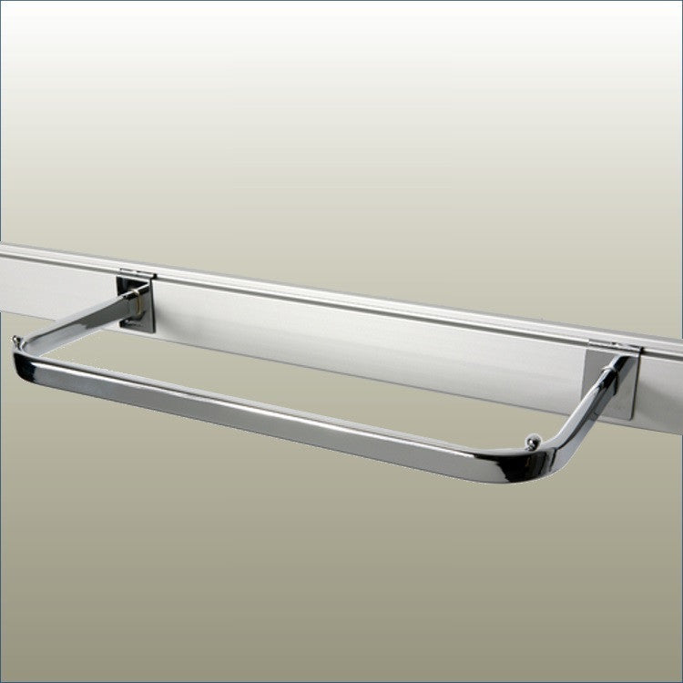 Plankwall chrome U-shaped garment rail brackets for displaying clothes, garments and other hanging items in retail environments, trade shows, as well as in home laundries. Complete with small stopper balls to help keep items sitting neatly in place.