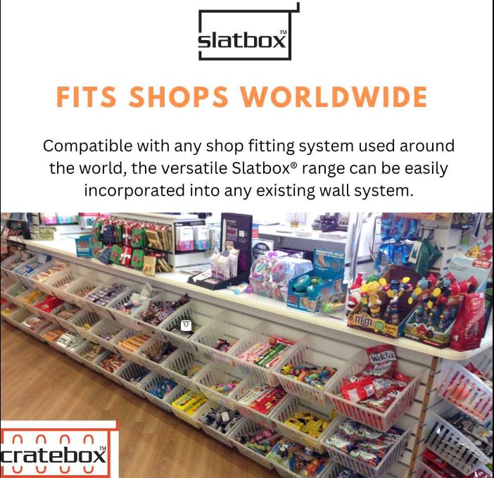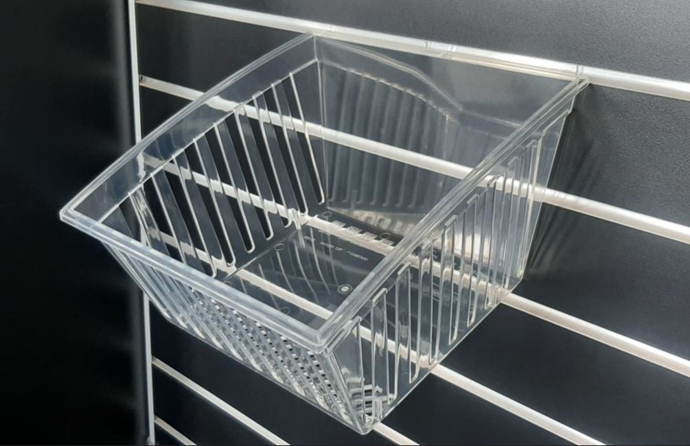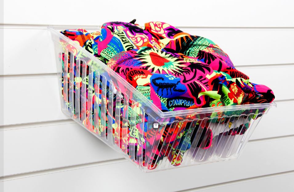 SLATBOX Cratebox™ Display Containers feature slatted sides for enhanced visibility of goods. A versatile light weight display container solution that works well with Plankwall slatwalls and other slatwall systems.