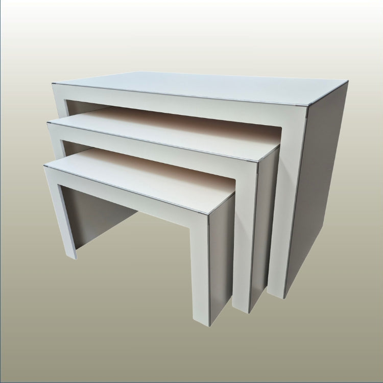 Plankwall® Nesting Display Tables are a set of three nesting display tables made from lightweight 12mm Melamine with aluminium edging for added durability. Choose from standard Prime White or a wide range of melamine colours and finishes. These display tables provide versatility for retail displays as well as exhibitions and trade shows - rearrange and move around to freshen up displays and adapt to changing store flows and merchandising needs.