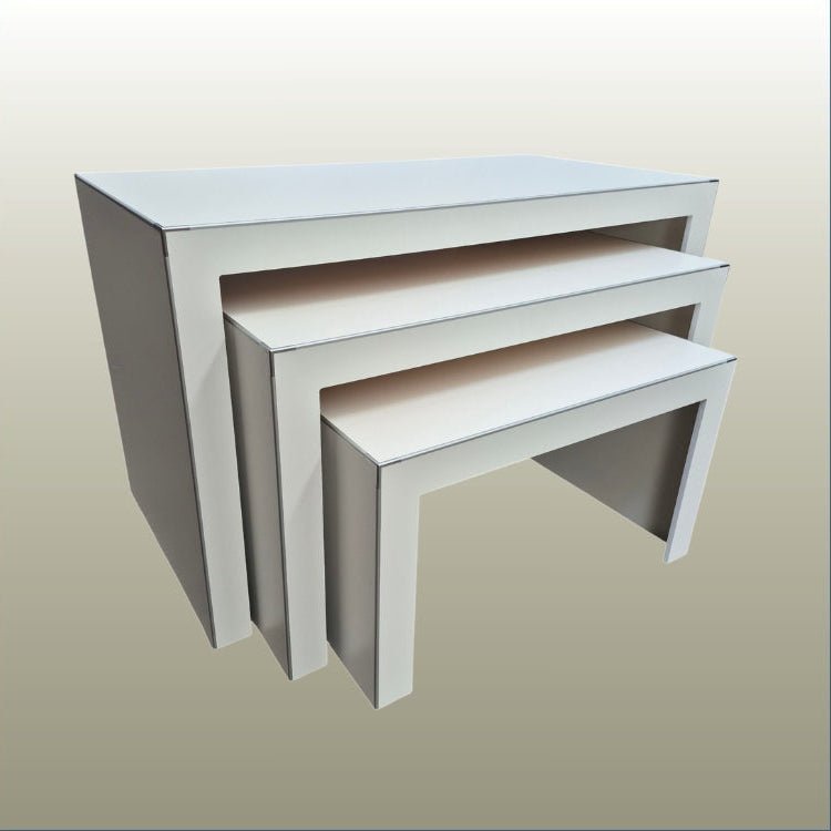 Create layered, flexible retail floor displays with Plankwall® Nesting Retail Display Tables. This set of three lightweight nesting tables is ideal for retailers, visual merchandisers, exhibitions, and trade shows, bringing height variation & structure to in-store displays while helping define product zones and guide customer flow.
