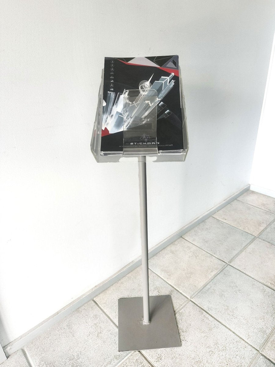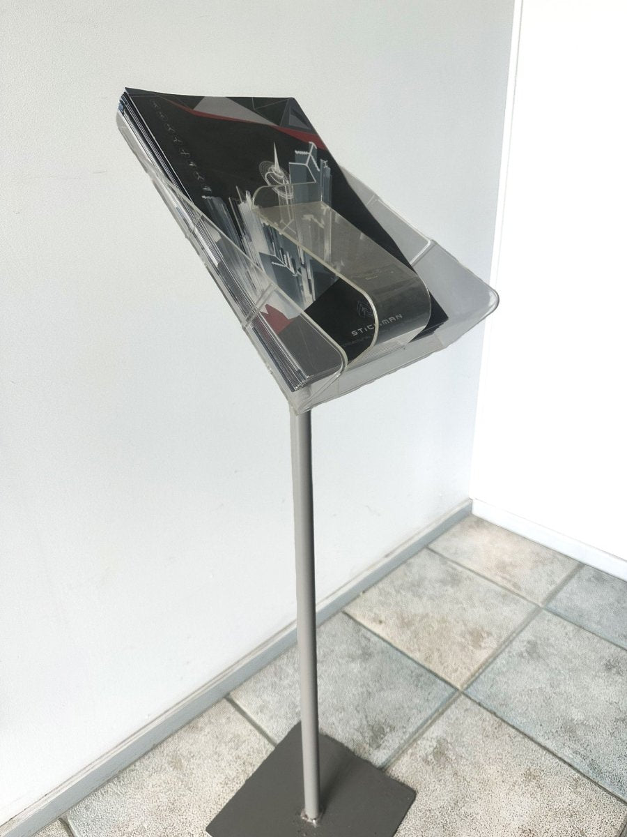A free-standing clear acrylic brochure holder with a spring-face stand, engineered to keep flyers, brochures, and catalogues upright, visible, and neatly presented — ideal for retailers, offices, hospitality venues, and showrooms across reception desks, foyers, and point-of-sale.