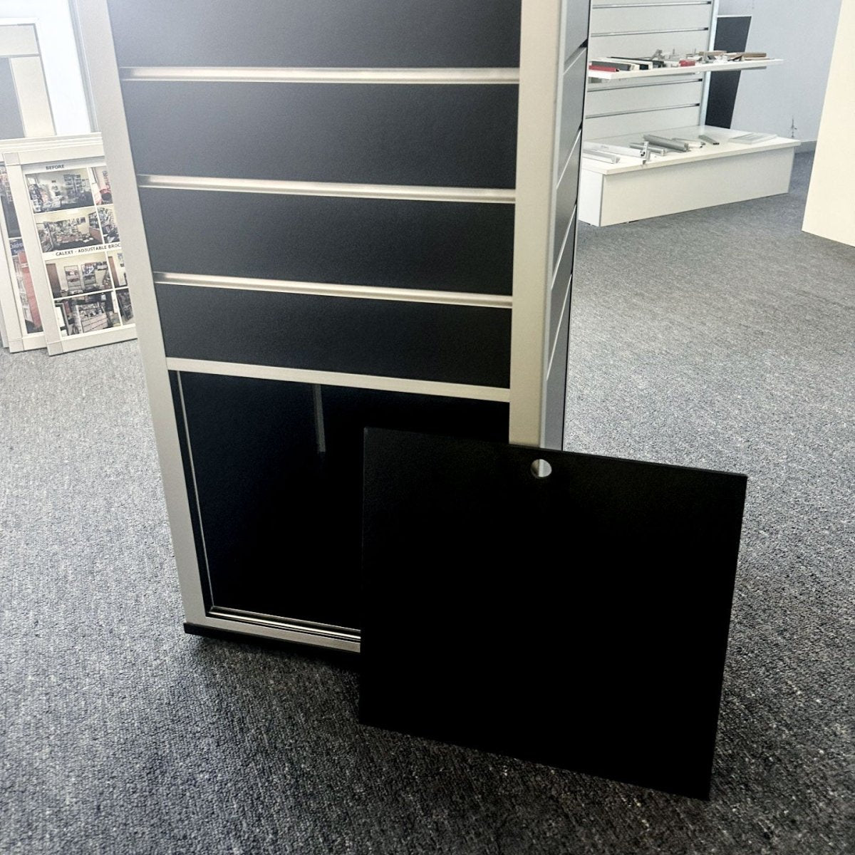 A popular freestanding four-sided rotating box display stand tower from Plankwall®, featuring slatwall display panels on all sides and a smooth-turning base for easy access.