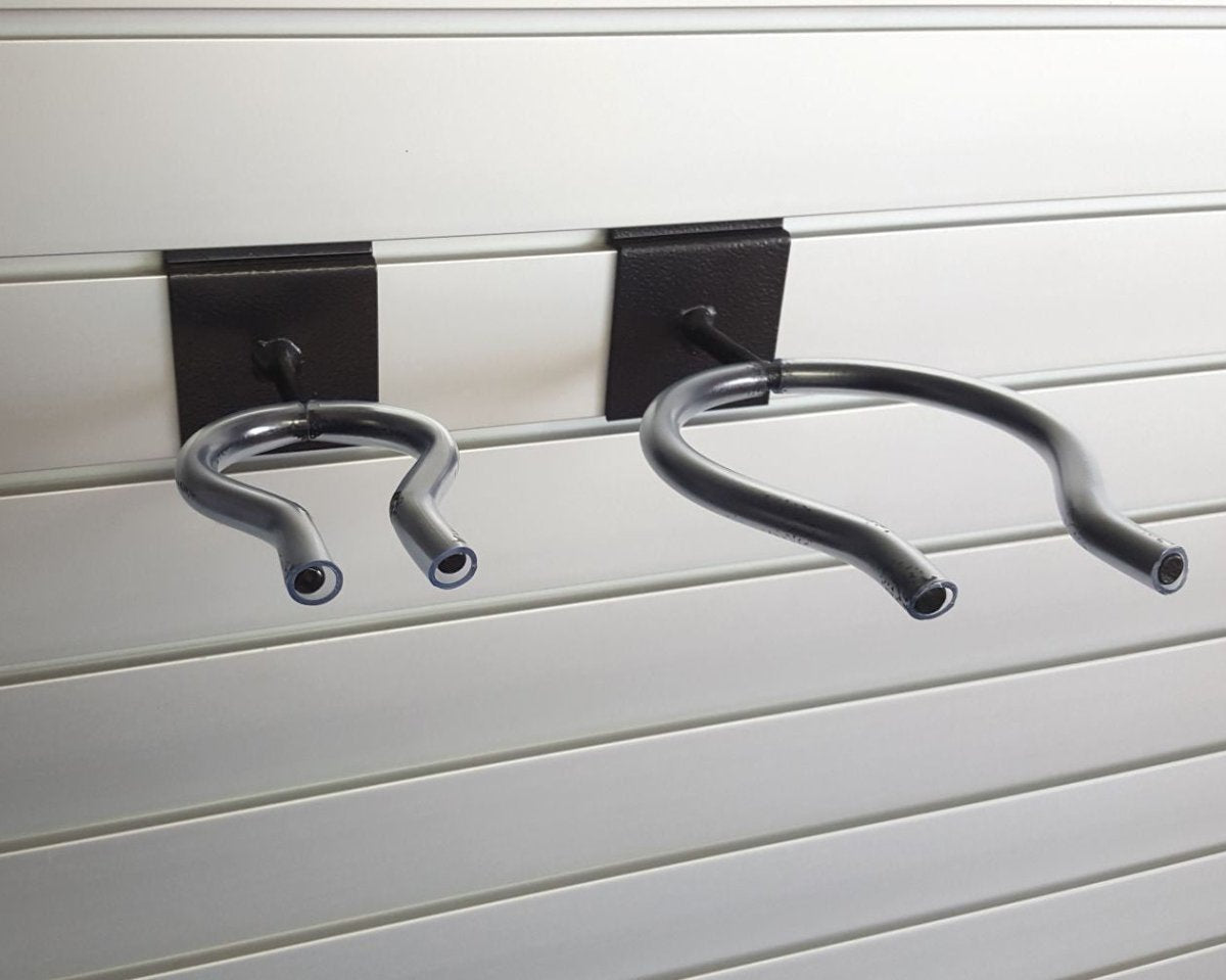 Plankwall Power Tool Display Brackets are powder coated steel brackets with supportive backplate and clear protective plastic tubes to prevent slippage when hanging heavy items such as power tools on Plankwall slatwall panels.